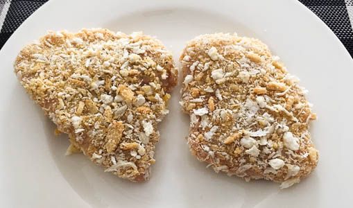 2 varkensoesters of ongepaneerde schnitzels, 25 gram Roka Cheese Crispies Gouda (1/3 doosje), 1 ei, handjevol bloem, 25 gram panko, olijfoliespray (bijvoorbeeld van Bertolli)
